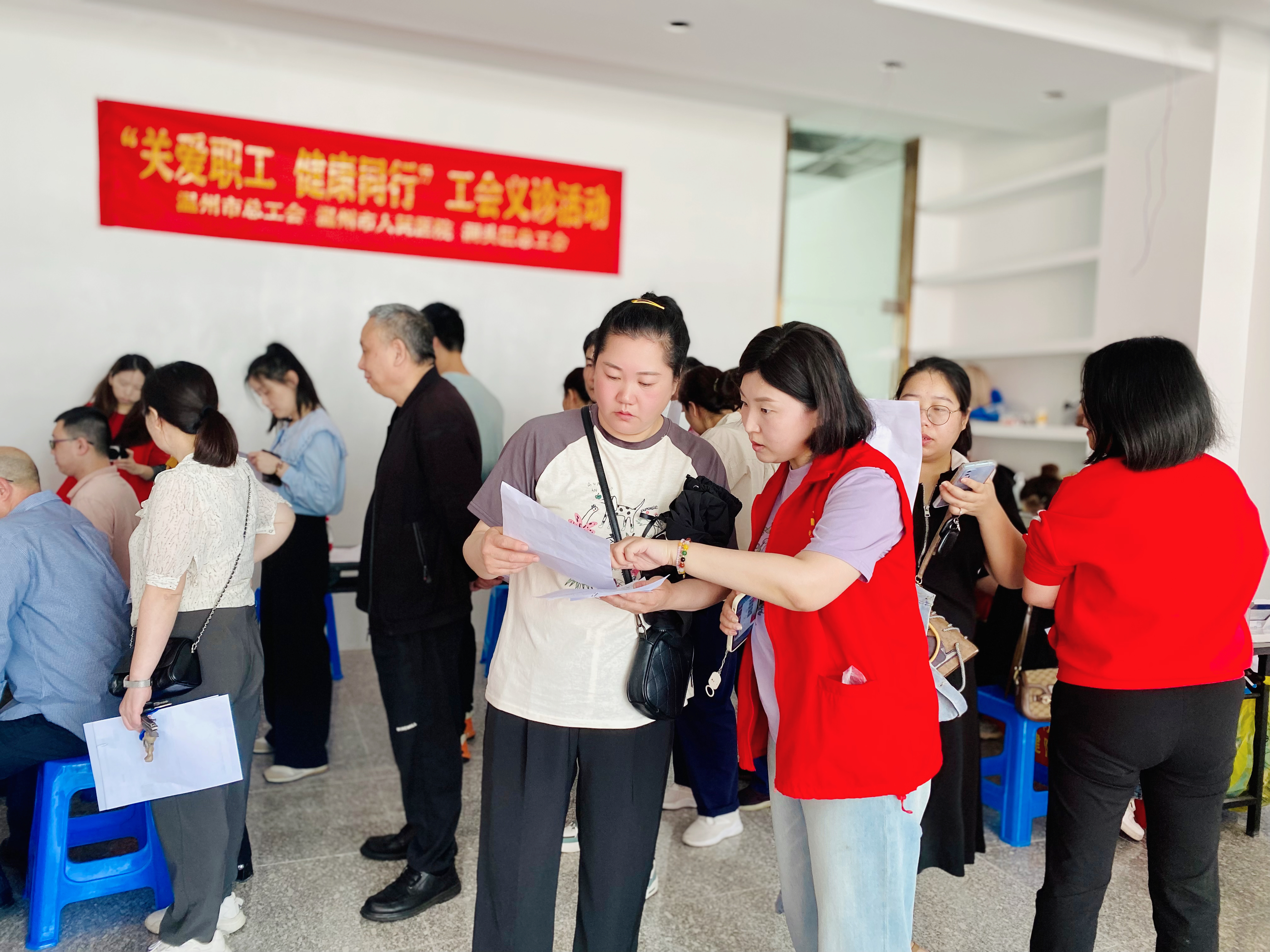 为切实提升企业员工就医的便捷性,进一步强化大家的健康意识、普及保健知识、传递健康理念、倡导科学的生活方式,2024年5月19日,温州市人民医院医技党支部、检验输血科党支部、外二支部与超声医学科“声入人心”志愿者团队携手温州市总工会,共同走进洞头杨文工业区,将健康关怀与专业服务延伸至企业一线,以实际行动守护广大员工的身心健康。